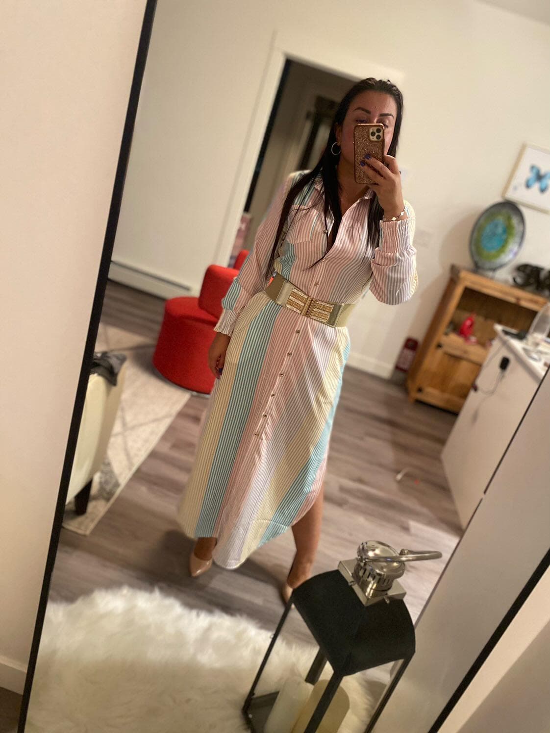 I love how the dress fits. No need to fix anything — you just put it on and go. I loved the color and how it hugs the body.